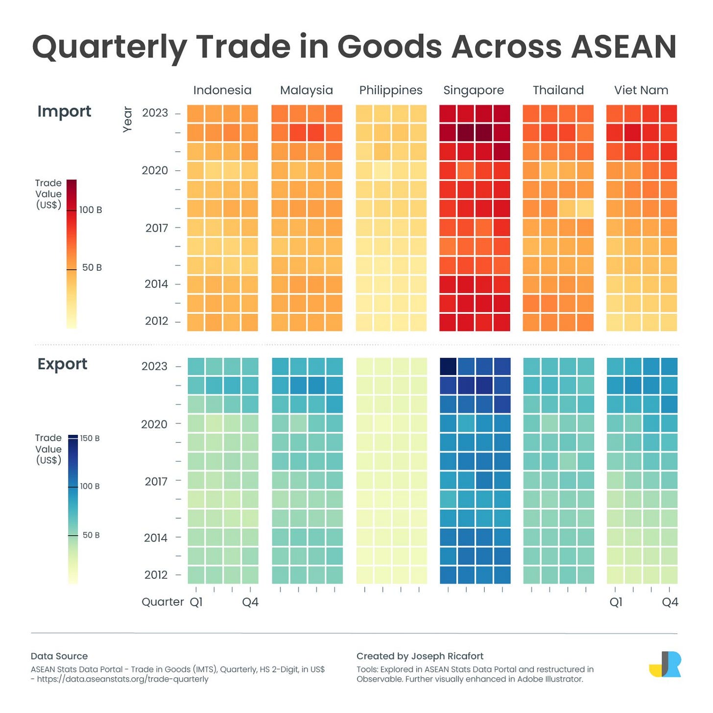 It’s no secret that Singapore leads Southeast Asian nations with more than half of total regional exports. But as the heatmap above from Straits Times digital graphics designer Joseph Ricafort shows, the city-state is also the region’s largest importer, with other countries trailing some distance behind.