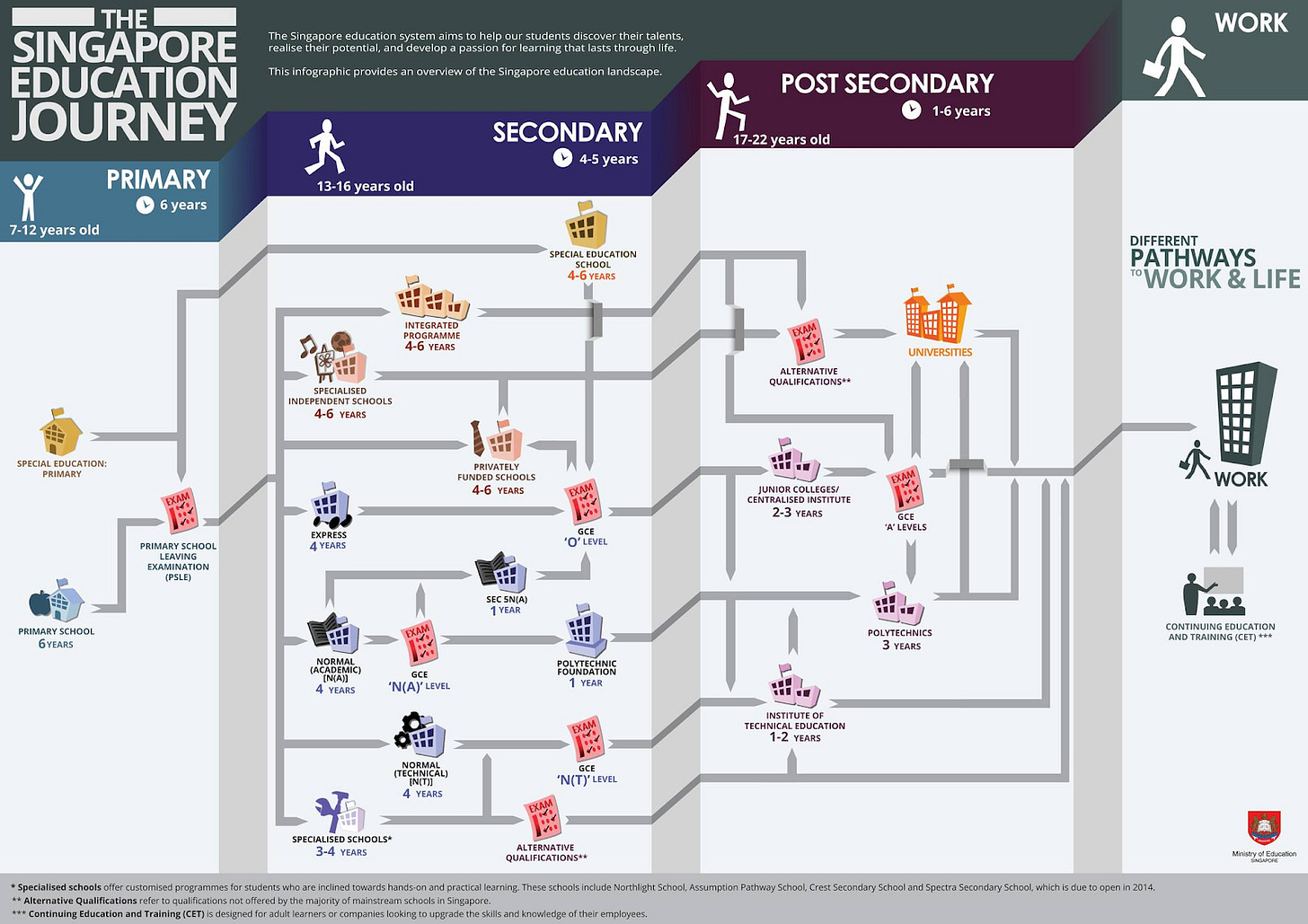 In Singapore, students have to spend at least 16 years progressing from primary school to university, depending on the academic path that they embark on. If students decide to change their academic path halfway, they may have to spend a few extra years to complete their education.