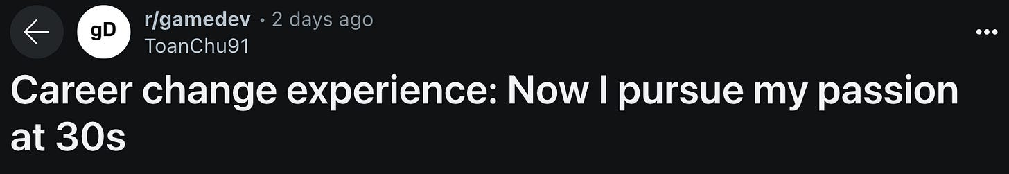 For example, a Reddit user shared his own experience pursuing his passion for game development at the age of 30, after working as an auditor, banker, and manager of an art studio.