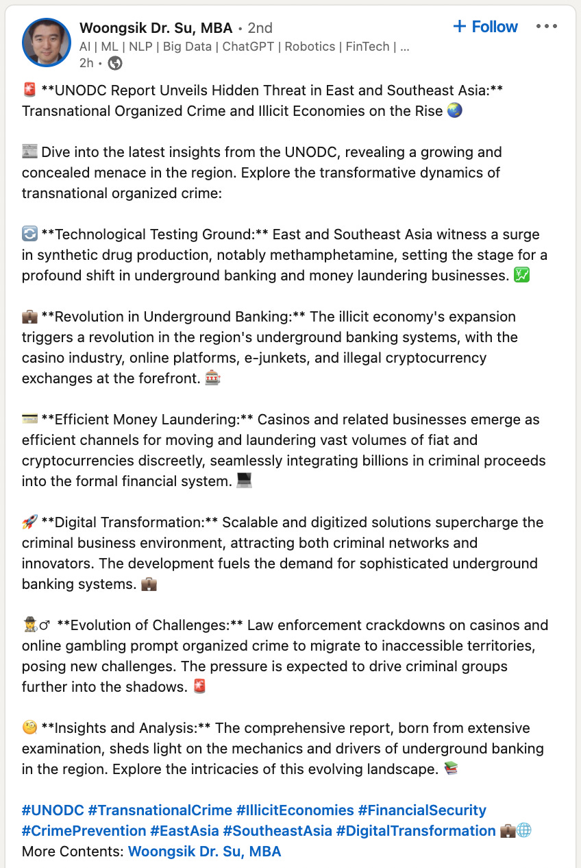 The report is a hefty 105 pages long. Thankfully, digital consultant Su Woongsik has a quick summary. He highlights key insights into East and Southeast Asia’s drug development, money laundering, and illicit banking businesses, and how this underground economy is evolving.