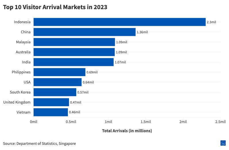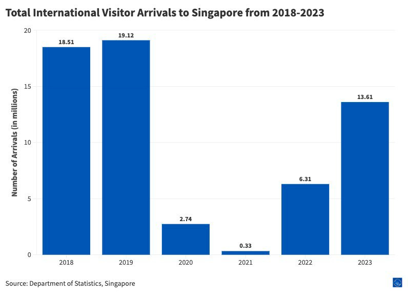 📌 Foreign visitor arrivals into Singapore reached 13.6 million in 2023, signaling a recovery in Singapore’s tourism industry after Covid-19.