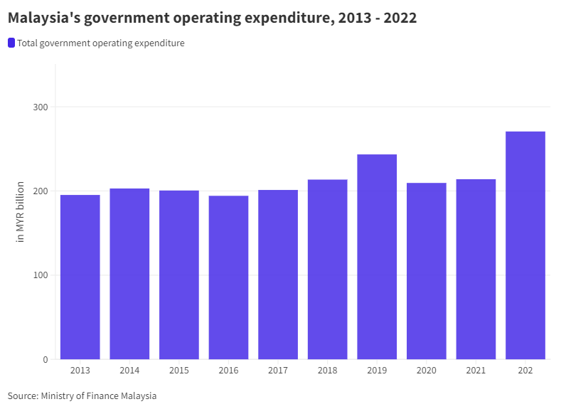 The government’s operating expenditure has increased, from RM211 billion (US$44 billion) in 2013 to RM292 billion (US$61 billion) in 2022.