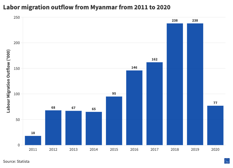Before the 2021 coup, the number of Burmese seeking foreign job opportunities grew from 18,000 in 2011 to a peak of 238,000 in 2018 and 2019.