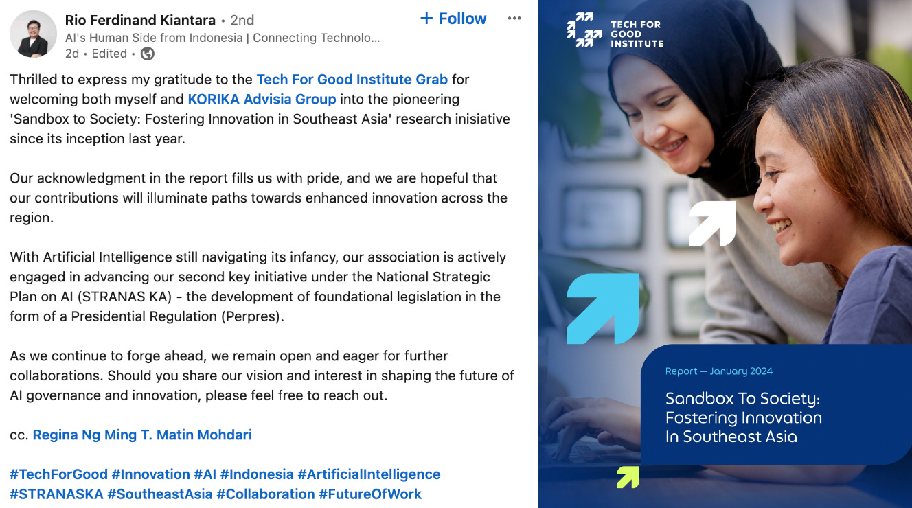 In a LinkedIn post, Rio Ferdinand Kiantara, Group CEO of Advisa Group shared a report from Tech For Good Institute, which suggests that regulatory sandboxes serve as an indispensable instrument for governments to mitigate risks and stimulate innovation.