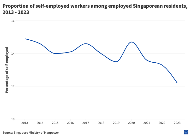 There was also a decline in the proportion of self-employed workers in Singapore, from 14.7% in 2020 to 12.2% in 2023.